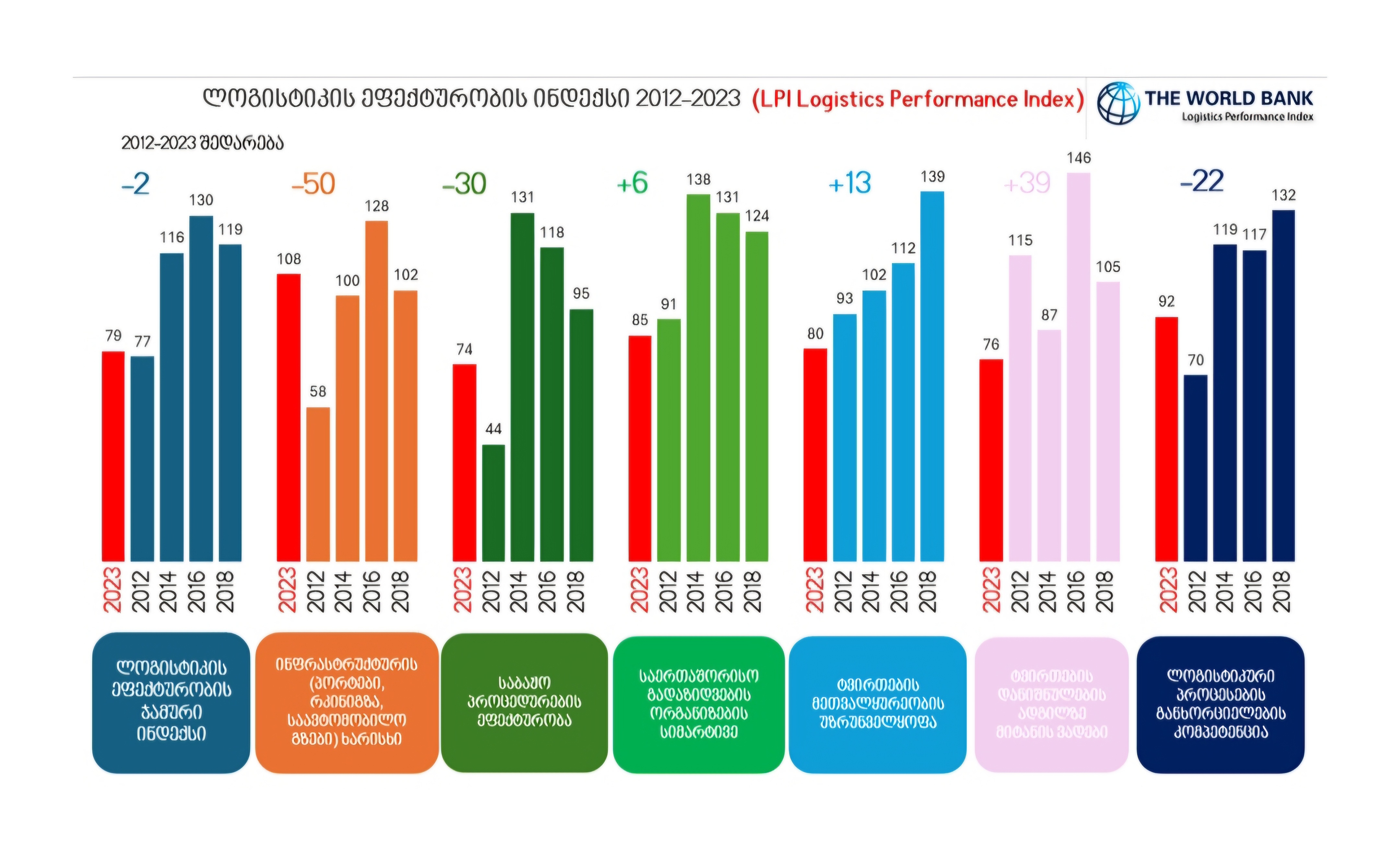 ლოგისტიკის ეფექტურობის ჯამური ინდექსით – 2012 წელს – 77 ე საფეხური, 2023 წელს – 79 ე საფეხური (გაუარესება 2 ადგილით);