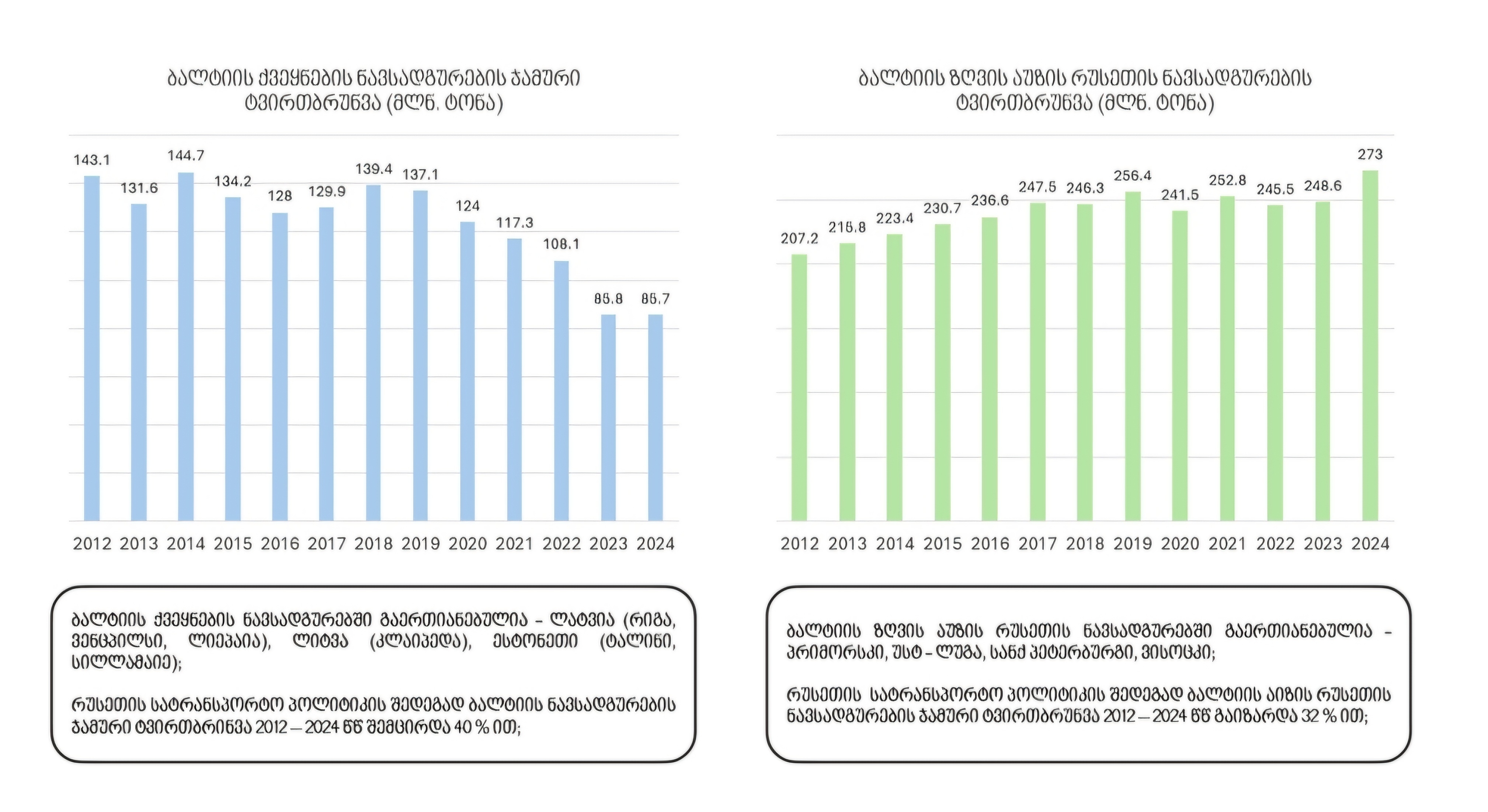 რუსეთის მიერ საკუთარი ნავსადგურების მიმართ გატარებულმა პროტექციონისტურმა პოლიტიკამ (იხ. დიაგრამა) გამოიწვია 2012 – 2024 წწ ბალტიის ქვეყნების ნავსადგურების ჯამური ტვირთბრუნვის 40 % ით შემცირება.