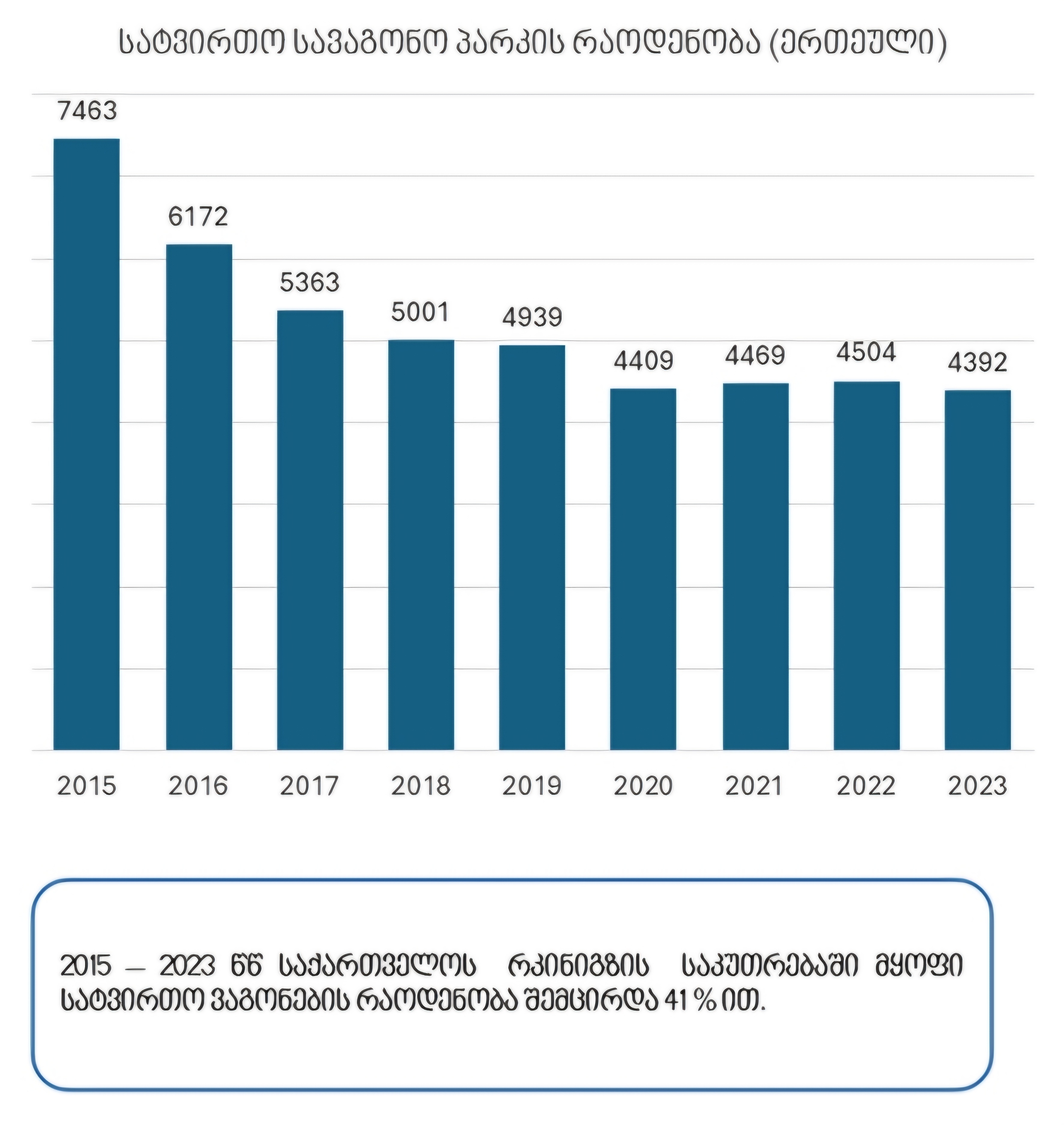 საქართველოს რკინიგზაზე 2015 – 2023 წლებში სატვირთო მოძრავი შემადგენლობის რაოდენობა ყოველწლიურად მცირდება (იხ.დიაგრამა). 2015 წელს თუ რკინიგზის საკუთრებაში 7463 ერთეული სატვირთო ვაგონი იყო, 2023 წლის ბოლოსთვის 4392 ერთეულს ფლობს, ამ პერიოდში 41%-ით შემცირდა სავაგონო პარკის რაოდენობა.