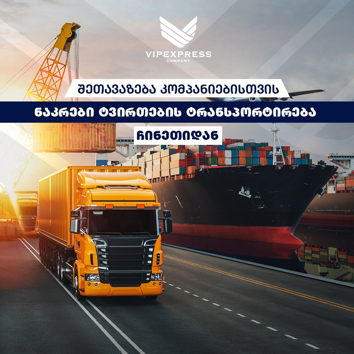 VIPexpress transportation სატრანსპორტო კომპანიაა, რომელიც ოპერირებს ჩინეთ-საქართველოს ტერიტორიაზე. ჩვენ გთავაზობთ ნებისმიერი სახის ტვირთის ყველაზე სწრაფ, იაფად და უსაფრთხო ტრანსპორტირებას ჩინეთიდან საქართველოს მიმართულებით, როგორც საჰაერო, ისე სახმელეთო და საზღვაო გადაზიდვებით. ჩვენ გამოგვარჩევს მუშაობის მრავალწლიანი გამოცდილება 1995 წლიდან, ინდივიდუალური მიდგომა თითოეული მომხმარებლისადმი, სანდოობა და მაღალკვალიფიციური კადრები.